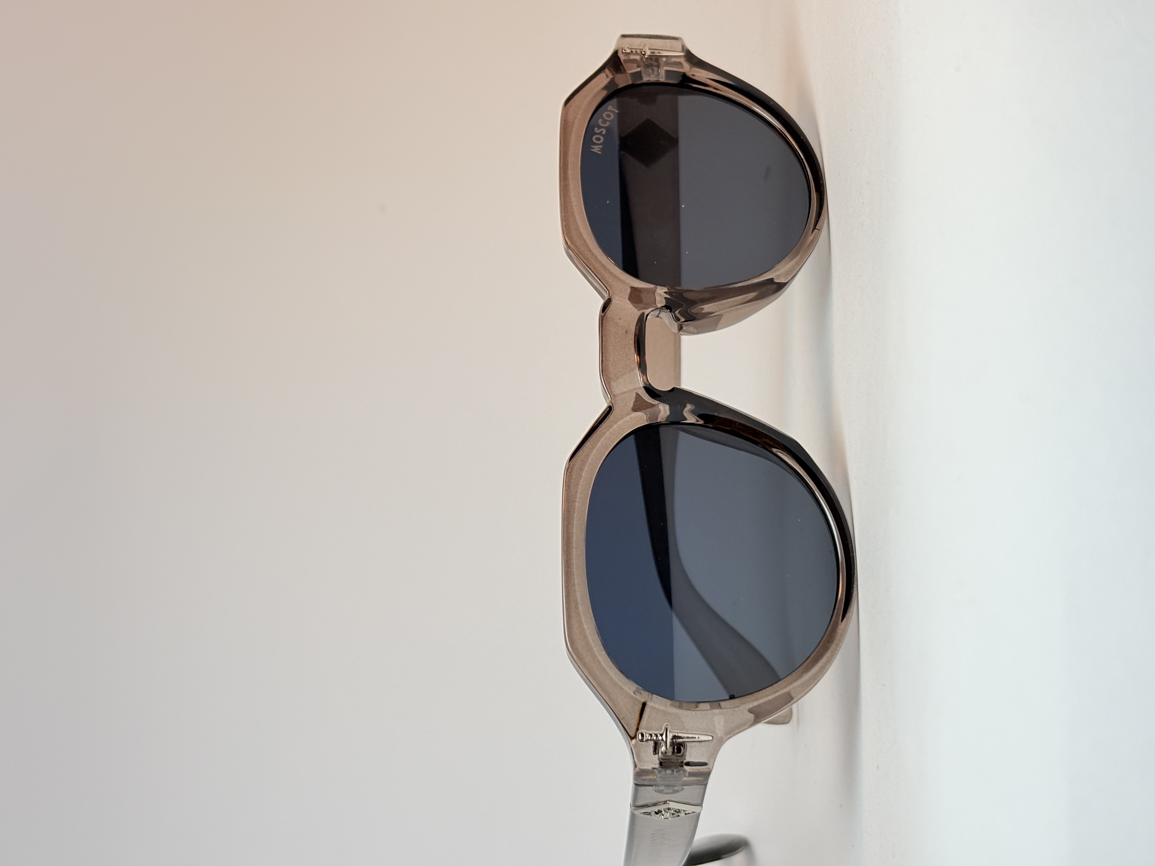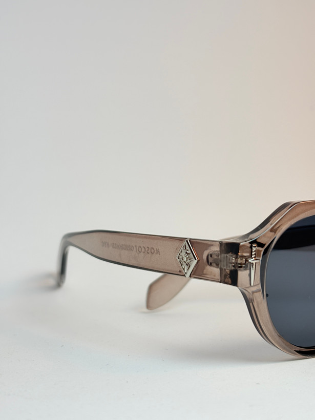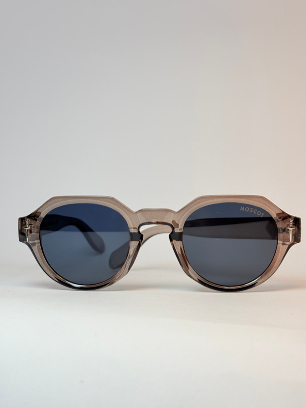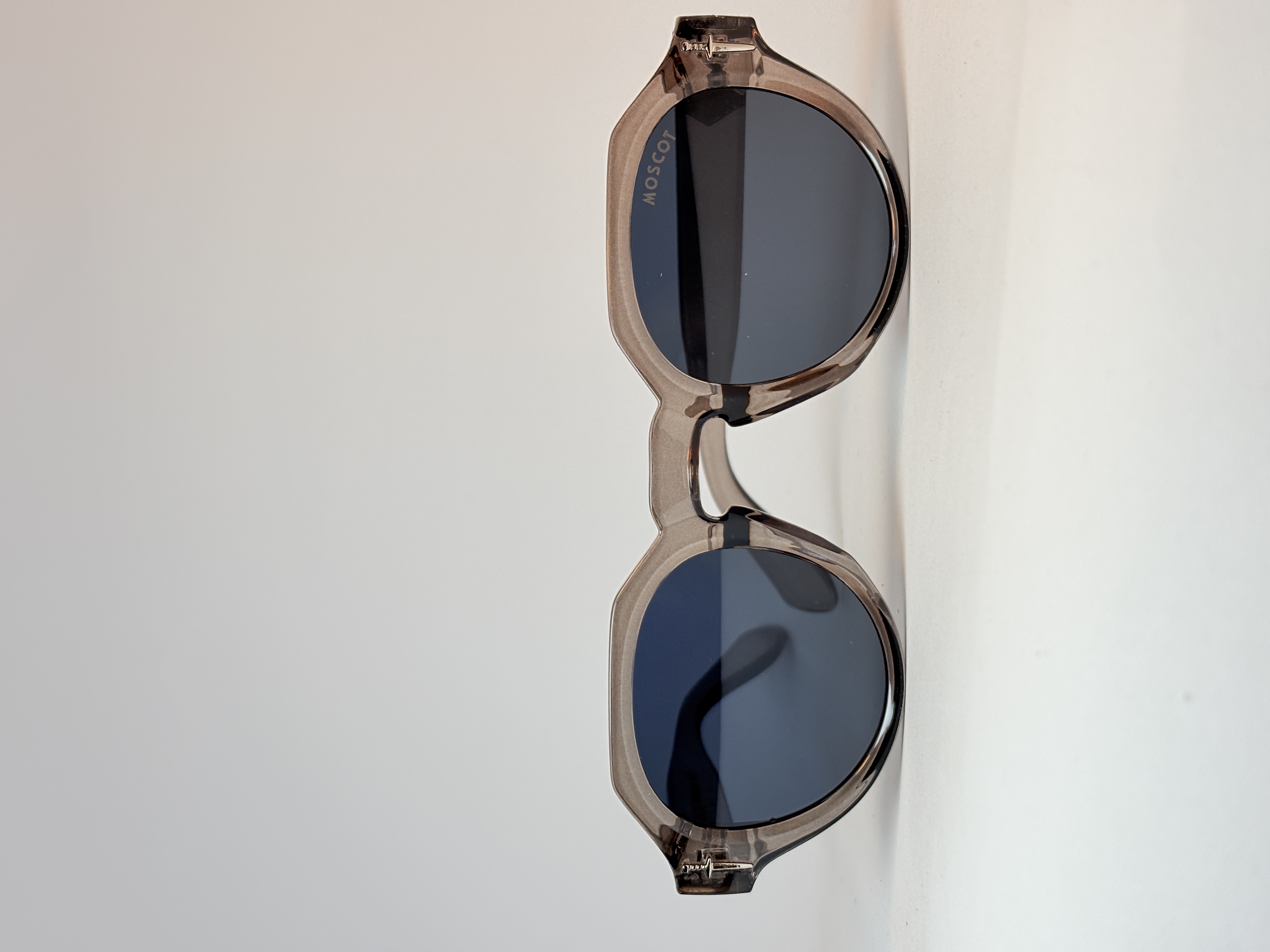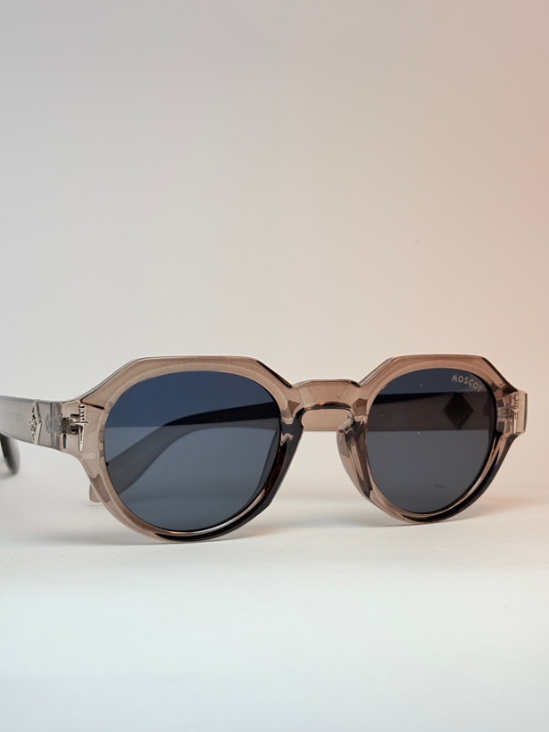 یک عینک آفتابی گرد با فریم تمامشیشهای به رنگ طوسی مهآلود.