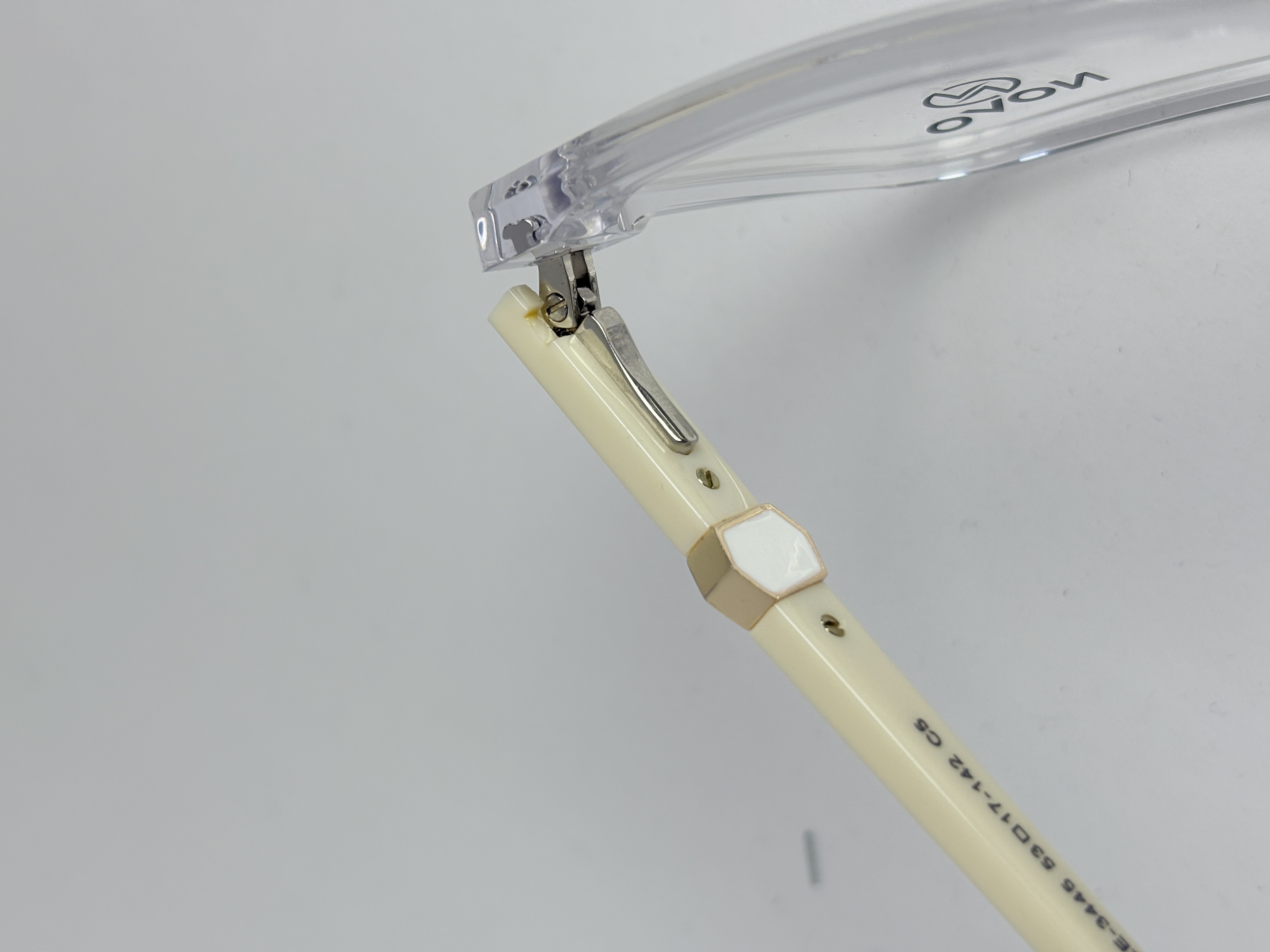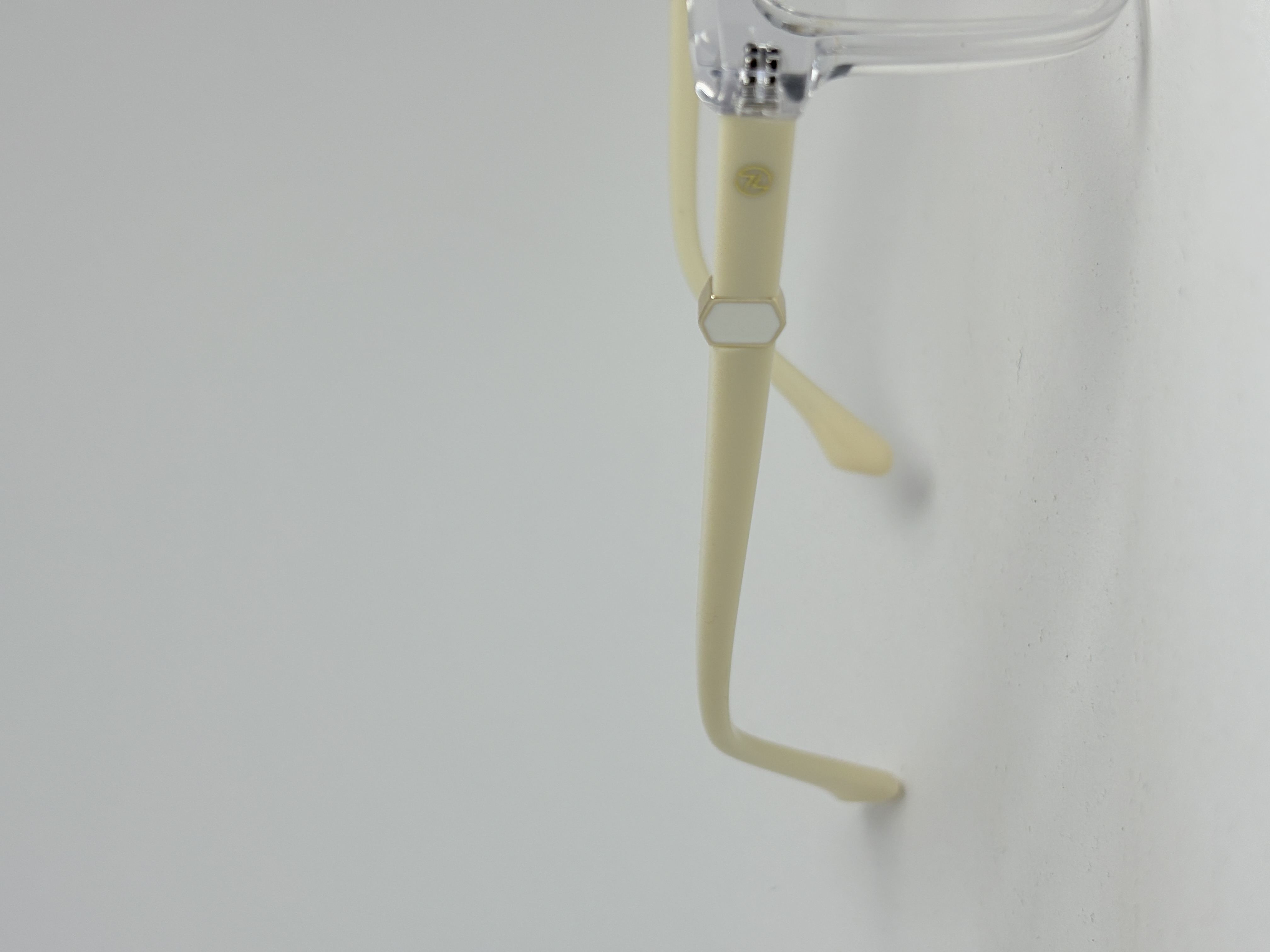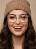 🎯 یه عینک طبی زنونه با فریم مربعی شیشهای و دستههای کرم رنگ خاص